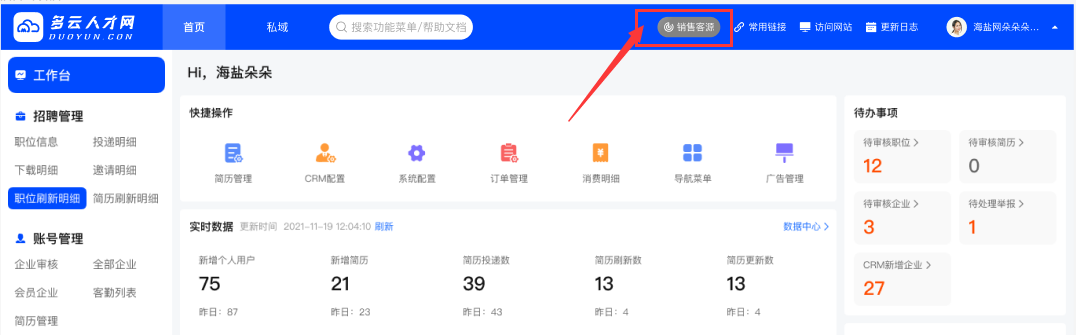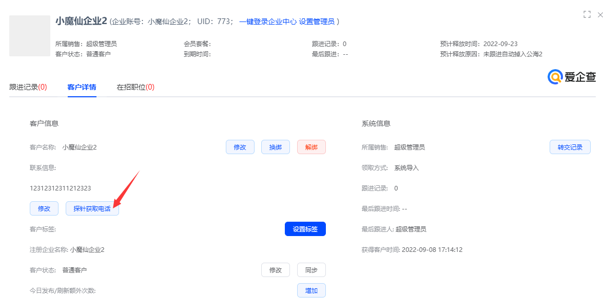 | 公共客户 | 在【公共客户】里的企业,换句话说,公共池里的客户在别的平台发布了招聘信息,说明这部分CRM客户是有招聘需求的 | 蓝色 | 1.点击列表里的企业名称查看企业详情页2.点击'详情'按钮查看招聘后台的【客户详情】 |