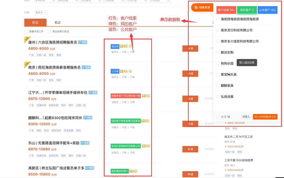 | 客户线索 | 不在【全部客户】里的企业,换句话说,这些在其他招聘平台发布了职位的企业,还不是咱平台的CRM客户 | 红色 | 1.导入并获取联系方式导入【我的客户】,导入客源的同时会获取该企业的联系方式企业名称必须与营业执照一致才能获取到联系方式2.仅导入导入【我的客户】,不获取联系方式 |